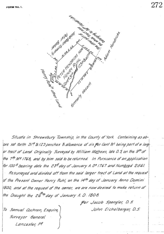 [7] Pennsylvania Archives Land Office Survey, C172-273, re-survey made in 1800 for Henry Ruhl, [PA Survey Map], [PASurveyBooksIndex].