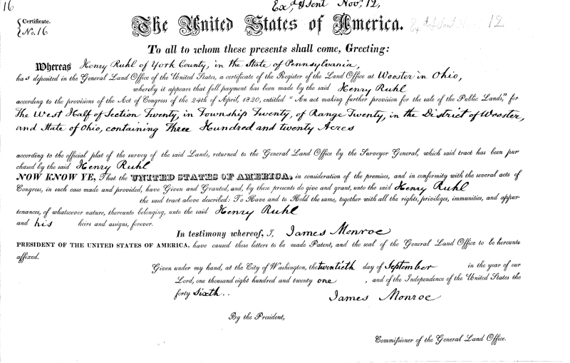 1820 Henry Ruhl, of York County, Pennsylvania, purchased 320 acres in Richland County, Ohio, on October 4, for $400. The land patent was dated September 20, 1821 and was signed by President James Monroe. Henry Ruhl warranted 320 acres at the Crawford County Ohio land office on September 20, 1821, perhaps referring to the same land. [77] [Photocopy] 1821 Ohio land grant record for Henry Ruhl.[78]