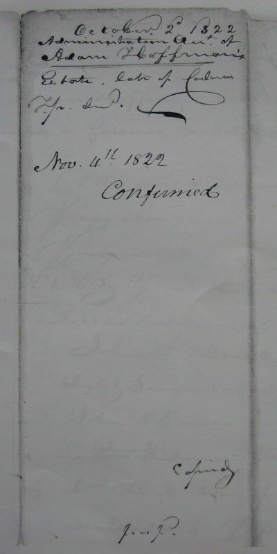 1822 Adam Hoffman's estate account was administered on October 2. Transcription follows (Copy is hard to read):