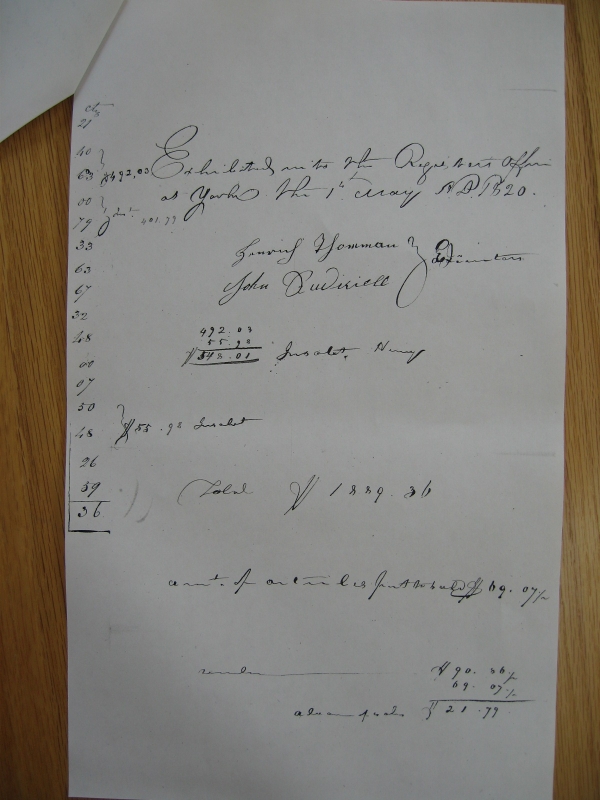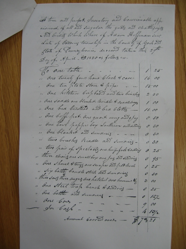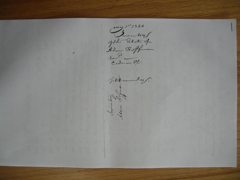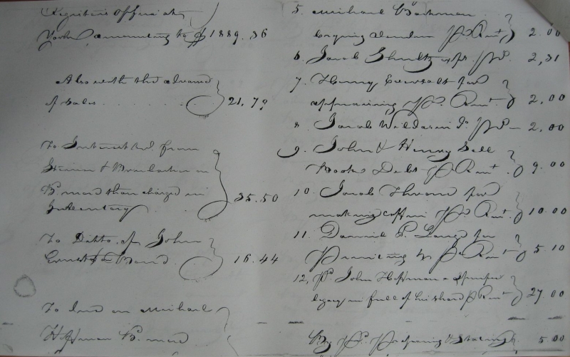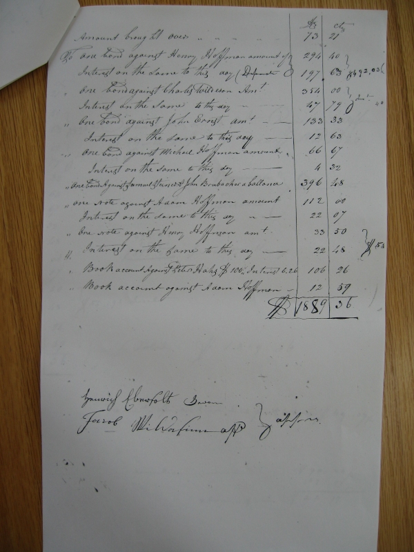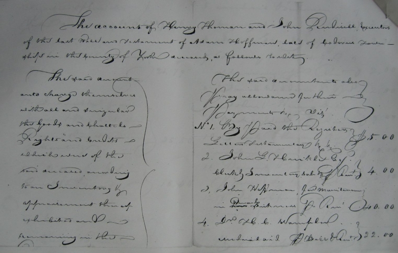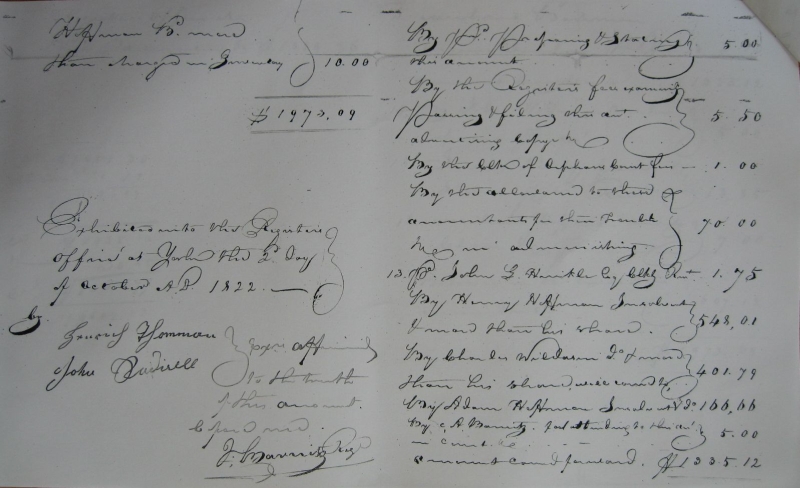 The accounts of Henry Thoman and John Rudisill, executors of the last will and testament of Adam Hoffman late of Codorus Township county of York deceased as follows to ? The said accountants charge themselves with all and singular the goods and chattels Rights and credits which were of the said deceased according to an inventory and appraisement thereof exhibited and remaining in the Register's office at York amounting to $1889.36. Also with the advance of sales 21.79. To Interest ? from Steiner and Branharker on B?ard than charged in Inventory 35.50. To ditto of John ? 16.44. To ? on Michael Hoffman ? than charged in inventory 10.00. $1973.09. Exhibited unto the Register's Office at York the 2nd day of October AD 1822. Thoman, John Rudisell, expr affirmed to the truth of this amount . before me, J Barnitz, Reg.