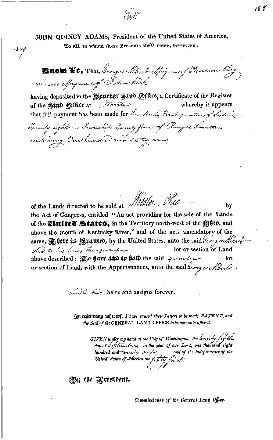 1826 George Albert received a patent from President John Quincy Adams for land in Milton Twp, Richland County, Ohio. The tract was 160 acres in section 28. The original title was to John Kirk of Brook County, Virginia, signed in 1813 with price 259.88. John Kirk assigned the land to Davidson King, who assigned it to George Albert. [37]