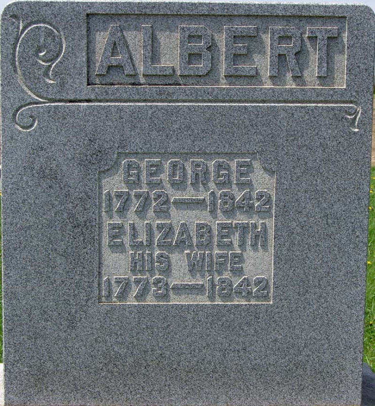 1842 A memorial stone for George Albert (1772-1842) and Elizabeth his wife (1773-1842) is at the Brubaker Cemetery in Ashland County, Ohio. [52] [53]