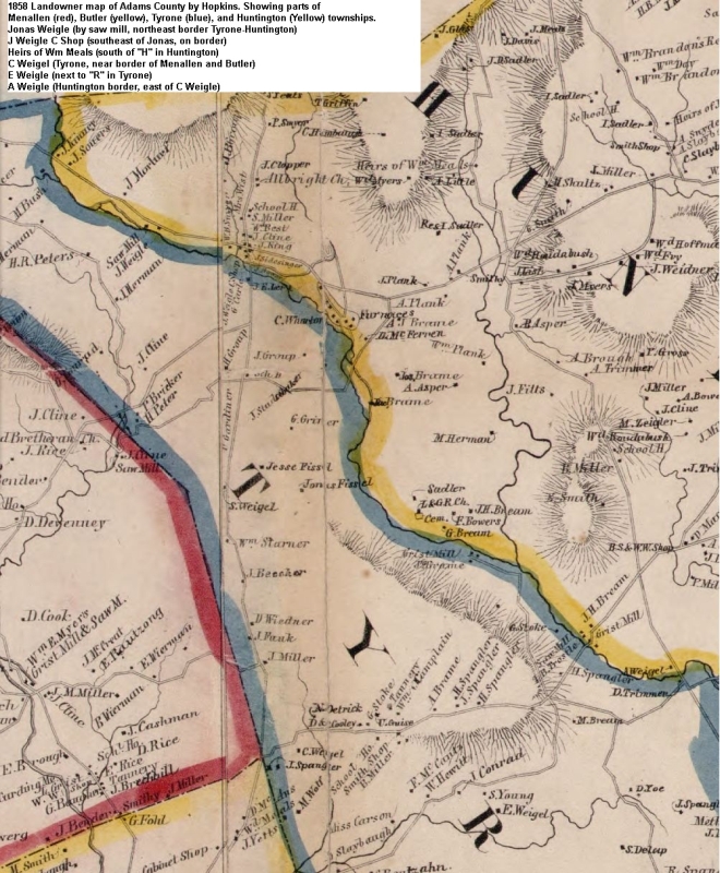 1858 A map of landowners in Adams County showed J [Jonas?] Weigle [24] near J Morturf and Souers, both listed in the 1850 census on the same page as Jonas Weigle, on the Upper Bermudian Creek on the Huntington side of the border between Tyrone and Huntington townships. J Weigle, perhaps Jonas' father, C shop was southeast on the Bermudian. [25]