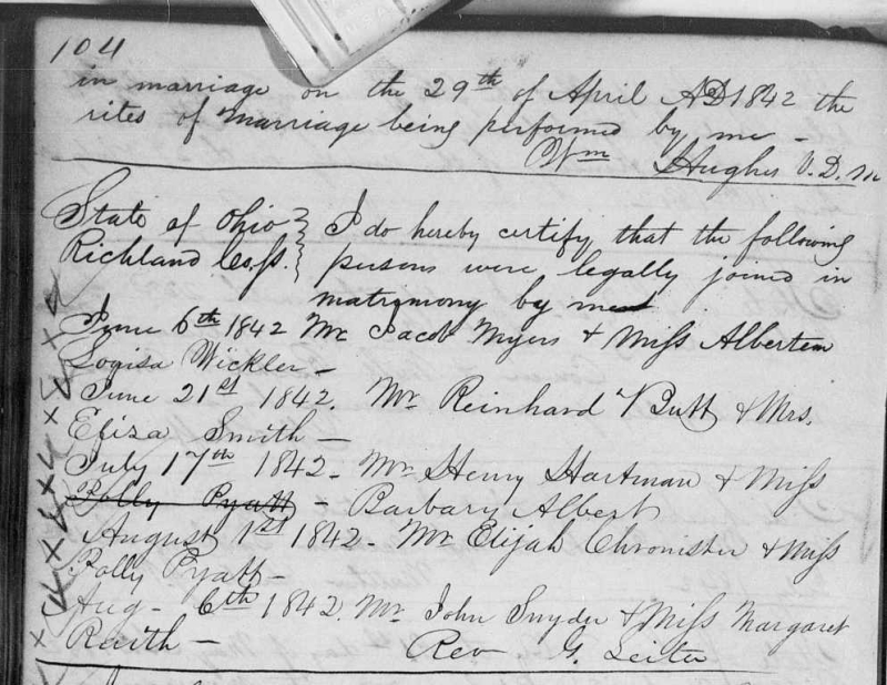 1842 Henry Hartman and Barbary Albert [Barbara Albright] were married on July 17, in Richland County, Ohio [2] [Photocopy, Marriage records for Henry Hartman and Barbara Albright.]