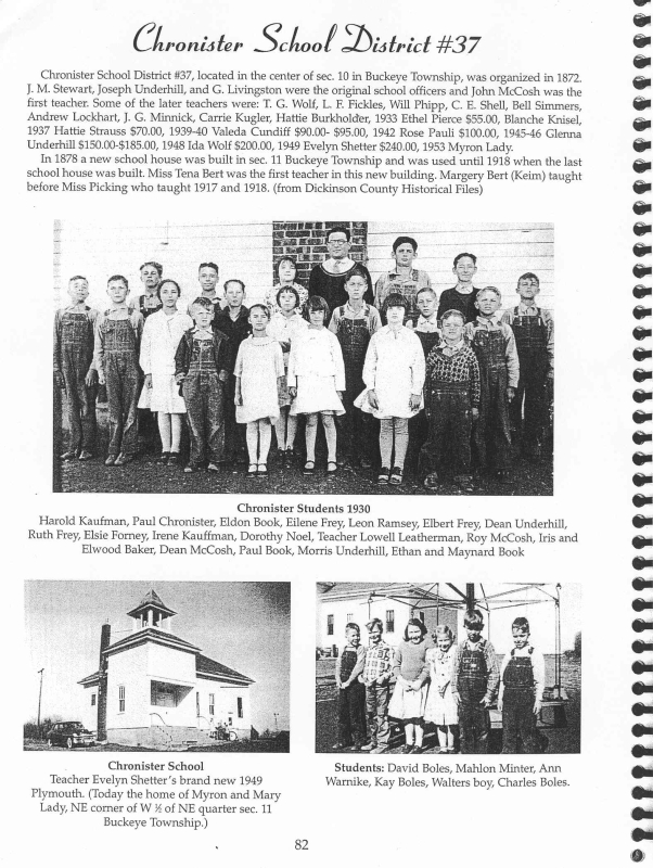 Chronister School District #37, located in the center of sec. 10 in Buckeye Township, was organized in 1872. J.M. Stewart, Joseph Underhill, and G. Livingston were the original school officers and John McCash was the first teacher. Some of the later teachers were: T.G. Wolf [possibly a transcription error for IG Wolfe], L.F.Fickles, Will Phipp, … In 1878 a new school was built in sec. 11 Buckeye Township and was used until 1918 …
