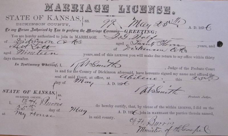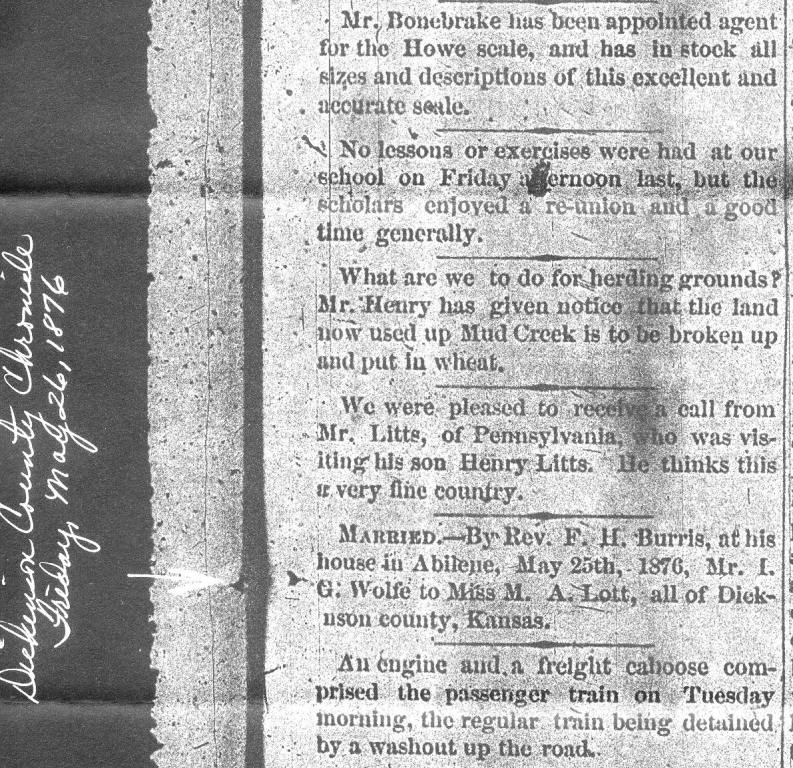 1876 A newspaper announcement reported "Married - By Rev. F.H. Burris, at his house in Abilene, May 25th, 1876, Mr I.G. Wolfe to Miss M.A. Lott, all of Dickinson County, Kansas." [36]
