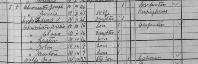 1880 Ira Wolfe was listed as a widowed stepson living with Annie and Joseph Chronister in Cheever Twp, Dickinson County, Kansas along with Annie and Joseph's children Laura V. Luke and Willis, Clara, Austin, John, and Newton Chronister. [42] [43] [Photocopy, Ira Wolfe listing in the 1880 census for Dickinson County, Kansas.]