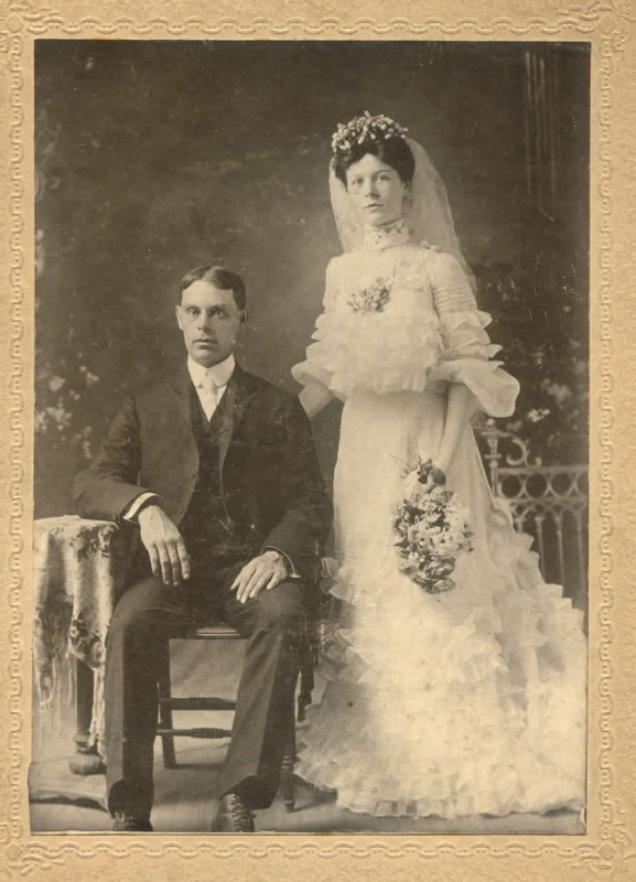 After this Mr. Wolfe went back to Abilene, Kansas. Here he met an old friend whom he had known in Pennsylvania, and who had come west in a covered wagon with her folks. This was Miss Clara Brenizer, daughter of Mr. and Mrs. Jacob Brenizer. After their courtship they were married in 1885, at Hadam, Kansas, when Ira was thirty-two Years of age. They then moved to Scott County in Western Kansas and settled on a 120 acre farm. They were located between Garden City and Scott City, which was in the stage of building up, and they often gave a night's lodging to folks who were traveling between those two points. It was here, Jan. 7, 1886, that their first child was born, whom they named Charles Marion Wolfe.