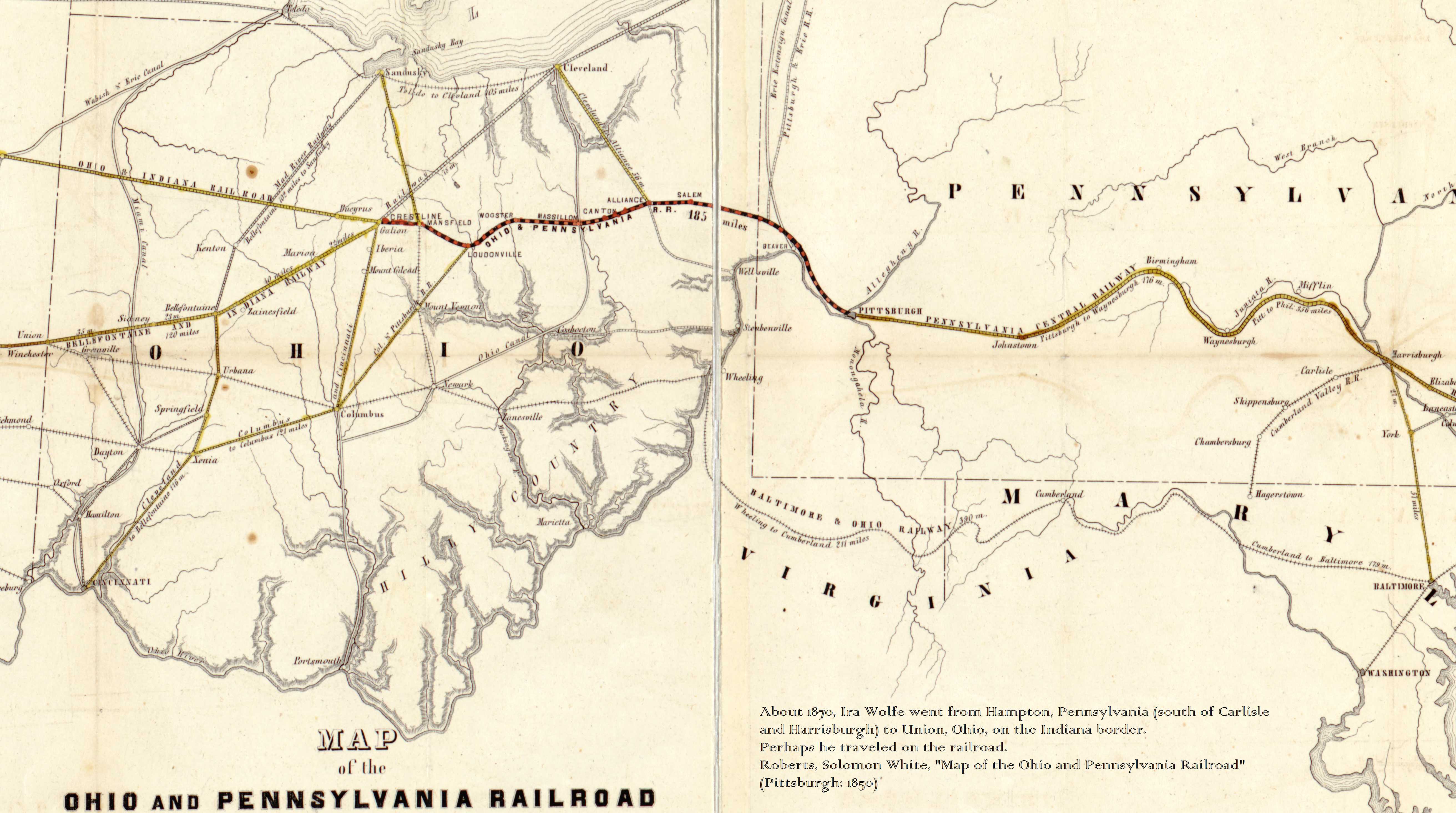 1870 According to the story that his son, Homer, wrote, Ira traveled, on foot, to Joseph Eichelberger's place in Darke County, Ohio. Ira went from Adams County, on the Pennsylvania-MD border, to Darke County, Ohio. Perhaps he went along the Ohio-Pennsylvania railroad through Harrisburgh and Pittsburgh or perhaps he went along the Cumberland railroad through Maryland, West Virginia, and Columbus, Ohio.