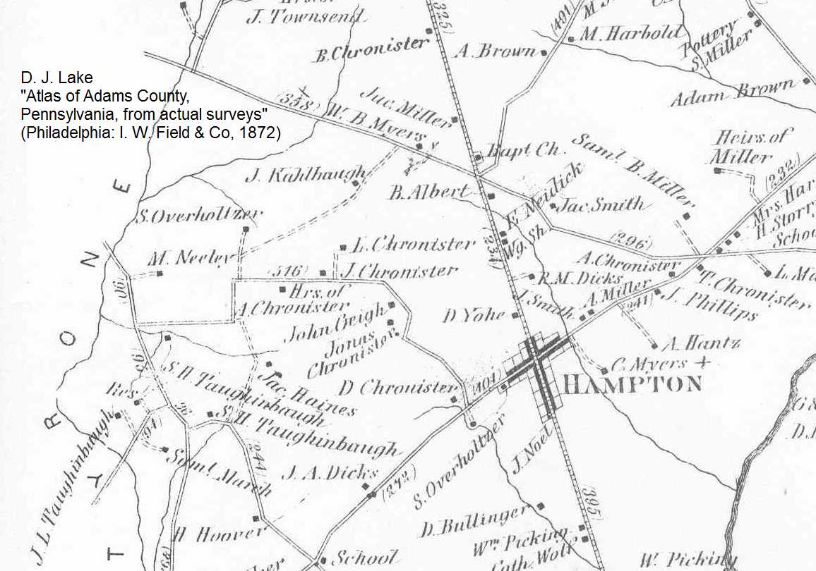 1850-1870 Ira lived near Hampton, Pennsylvania with step-father Joseph Chronister and mother Anna (Brenizer) Chronister, perhaps in one of the houses owned by Chronister families northwest of Hampton, shown in an 1872 atlas.