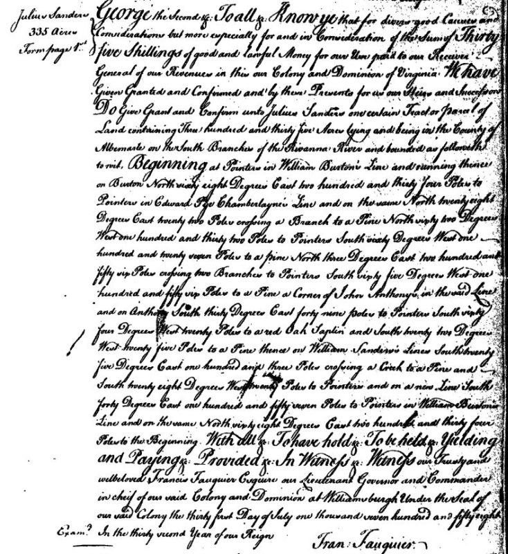 1758 Julius Sanders was granted 335 acres in Albemarle county on July 31. The land was on the south branches of the Rivanna River near land of William Burton and Edward Chamberlayne and John Anthony and William Sanders. [22] [Photocopy, Julius Sanders land grant in Albemarle, 1758.]