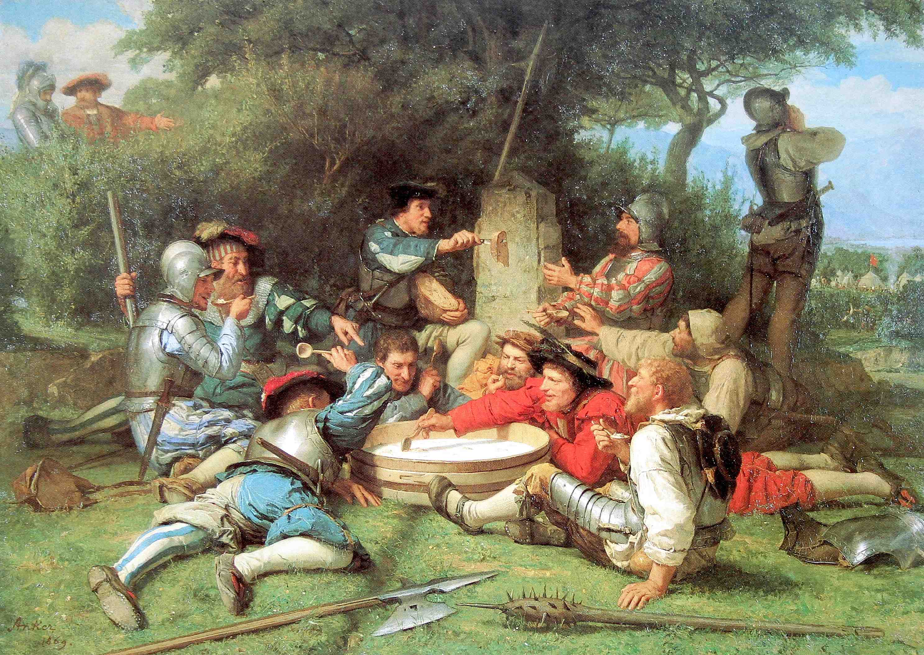 1529 Catholic and Protestant armies marched to Kappel, Zurich, Switzerland to fight. Negotiations led to a settlement without any battle. [6] The "Kappeler Milchsuppe" painting by Albert Anker celebrates the life of a soldier when peace is achieved.