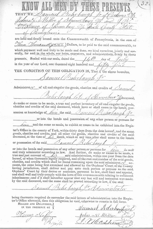 - Photocopy Administration bond of Samuel Rohrbach estate, 1855, page 1.