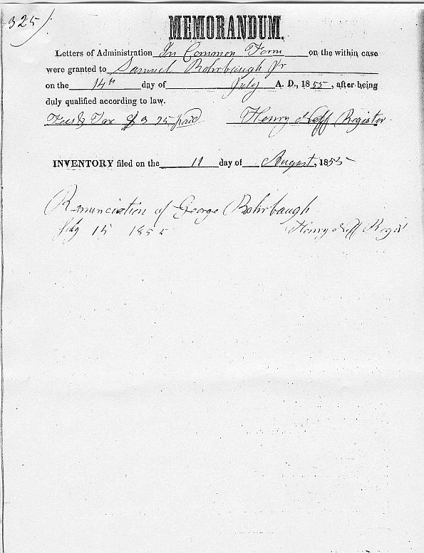 - Photocopy Administration of estate of Samuel Rohrbach, 1855, page 1.