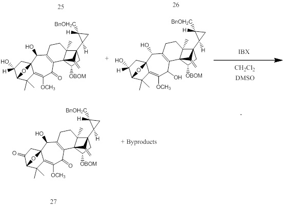 A type of parasite known as the cyst nematode lives on and destroys a variety of vegetables. One solution to the problem is to cause the nematodes to hatch prematurely. Solanoeclepin A is a key hatch-stimulating substance for the cyst nematodes. One intermediate step in the reaction is the conversion of molecules 25 and 26 to molecule 27. This reaction takes place through oxidation of certain -OH groups on molecules 25 and 26. This is obtained through the use of a common oxidizing agent, IBX.