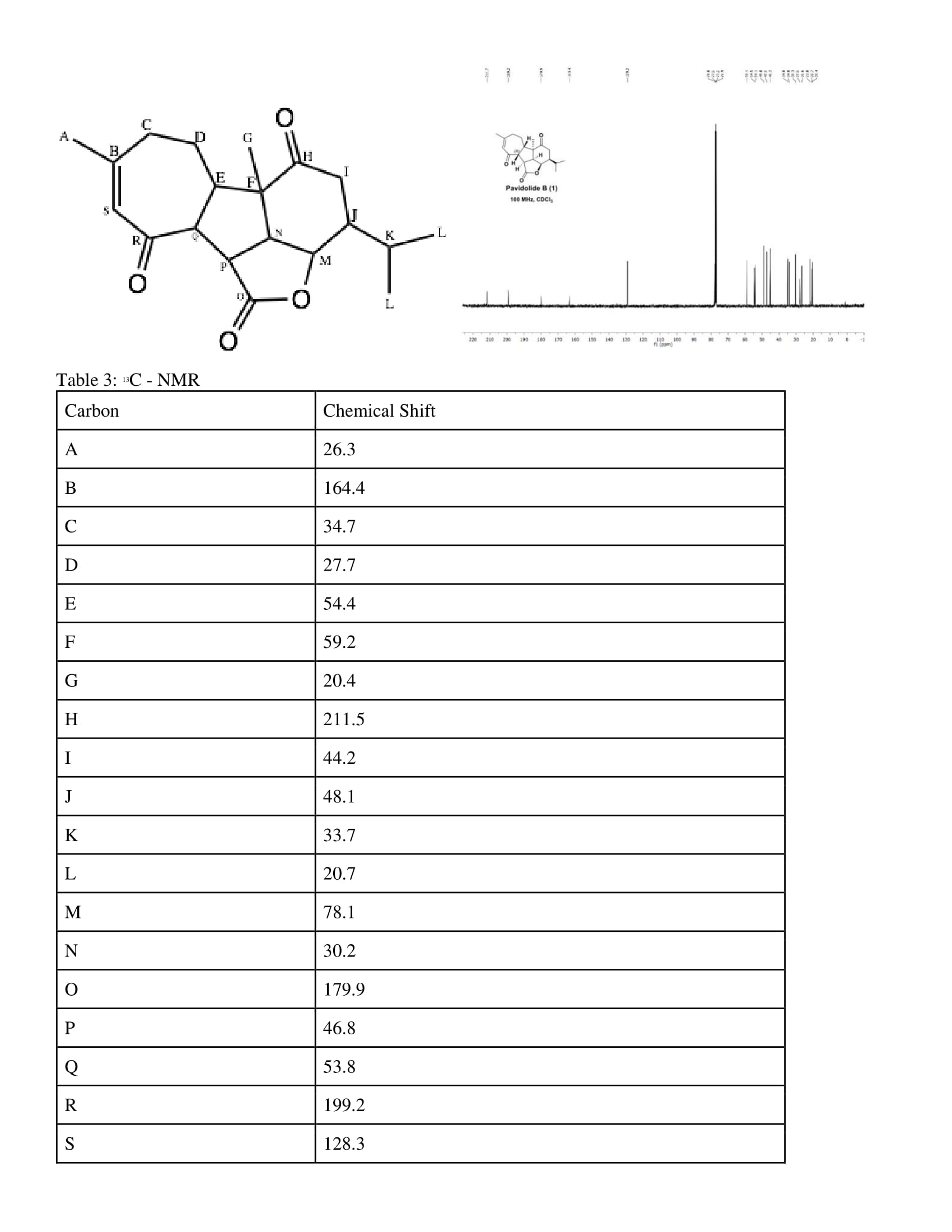 Carbon H has the highest chemical shift because it is directly double bonded to the oxygen atom from Carbon H making it deshielded. Carbon R was assigned the second highest chemical shift because even though it was bonded to a ketone, just like .Carbon O was assigned the next highest chemical shift because it is bonded to two Oxygen atoms but there is a major resonance structure resulting in higher electron density around Carbon O resulting in a lower chemical shift. Carbon B was assigned the next highest chemical shift because there is a minor resonance structure where the electron density shifts to carbon S. Carbon S was assigned a lower ppm than Carbon B because it has a resonance structure where the electrons from the double bond move to it since it is less substituted than B. The next highest chemical shift of 78.1 was assigned to Carbon M because it is directly bonded to an oxygen which is electronegative so it will pull electron density away from Carbon M making it more deshielded. Carbon F was assigned a slightly higher chemical shift because it is more substituted and carbons are less electron donating than hydrogens. Carbon I was assigned a slightly lower chemical shift than the previous carbons because it located next to the electron donating ketone while also being less substituted than the other carbons. Carbon K is more substituted than carbon C so it was assigned a higher chemical shift and carbon N is tertiary substituted and located in the center of a ring system it was assigned a lower chemical shift. Carbon A was assigned a lower chemical shift because it was a single methyl group that could be shielded by a weak resonance structure. Carbon D was assigned a lower chemical shift because it is a secondary substituted carbon that is not located near any electronegative atoms or electron withdrawing groups. Carbon L is actually 2 carbons and was the only value where there were two of the same chemical shift values present so it was assigned 20.7. Finally Carbon G was assigned the lowest chemical shift because it is a methyl group that is also located in close proximity to the electron donating carbonyl group which would lower its chemical shift.