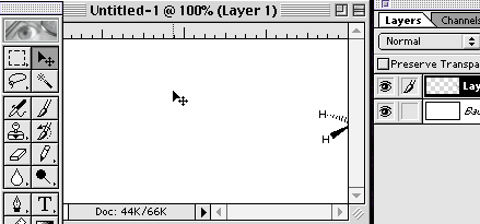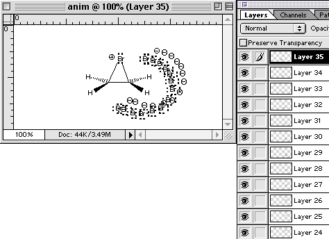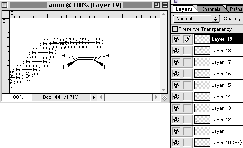 This page is here to help you construct your chemdraw animations. The animation is assembled exactly like a flipbook. You need to construct each frame using a graphics program (this help page uses Photoshop 5.0) and save each as a "gif". Each frame that you make is like a page in a flipbook. Then you can use GifBuilder (or another program) to put the frames together into a single file which is your animation.