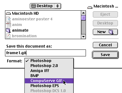 Next under the "Image" menu, drag over "Mode", and select "Bitmap". Click "OK" to flatten layers and discard the hidden layers (the ones you can't see). Now under the "File" menu, select "Save as..." and name your file "frame1.gif" and select "CompuServe GIF" under "Format".