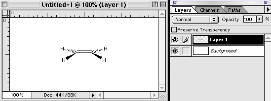 Then I "paste" the molecule into the photoshop file again. This creates a new layer. I position this molecule a little farther over from the molecule in the first layer as shown below.