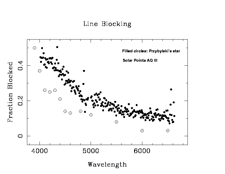 How could the six-colors of the star be like that of the sun, and the star be as hot as 7500K? An obvious explanation is line blanketing. Atomic absorption lines increase in density toward the violet. The overall color of the star changes with the strength of the atomic lines. The more lines, the redder the star appears. This effect is well known among cooler stars, and has been used to determine abundances of G stars from ordinary UBV photometry. Przybylski recognized the importance of blanketing, but felt that it was compatible with a temperature of about 6200K, only somewhat hotter than the sun.