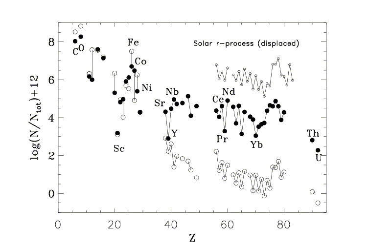 Filled circles are for HD 101065, open circles are the standard abundance distribution (SAD, or "solar"). The results (including points for uranium and thorium) look rather like a displaced solar distribution. There even appears to be a shadow of the third r-process peak, though it is displaced one or two units in Z. The solar r-process only abundances are plotted separately, but displaced upward to avoid confusion. Rare violations of the odd-even effect could be entirely due errors, but this remains to be seen. A table listing individual lines, equivalent widths, log(gf)'s, and abundances is now available.