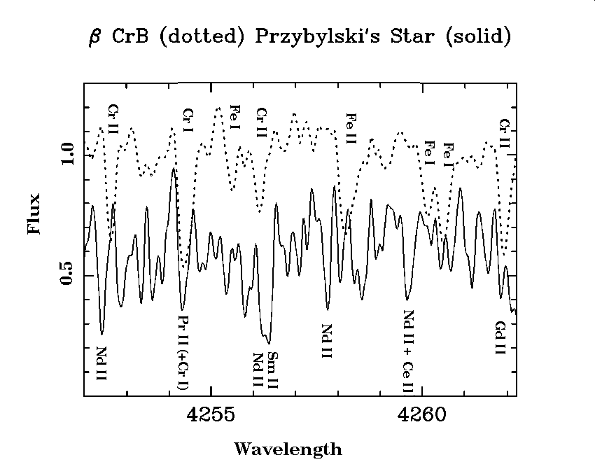 The Beta CrB spectrum (Courtesy of John Landstreet) has been displaced upward by 0.2 units of flux. The strong lines in its spectrum are of iron-peak elements, while those of HD 101065 are due to lanthanide rare earths. Note the strong feature at 4254.3, the position of the strongest Cr I line in this part of the spectrum. It is surely due to chromium in Beta CrB, but in HD 101065, it is probably mostly Pr II, with ``some'' contribution from Cr I.
