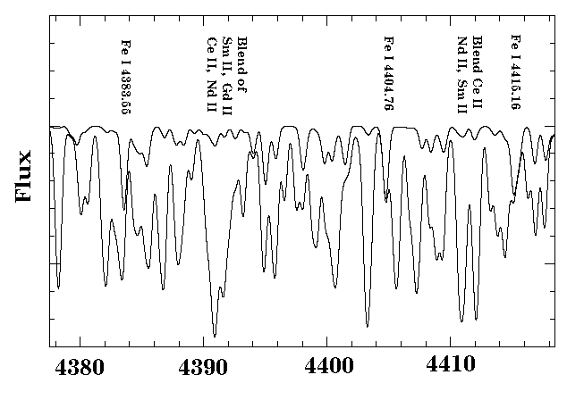 The upper spectrum was made assuming solar abundances, but with the iron-group abundances reduced by a factor of 10. Even so, the strong triplet, 4383, 4404, and 4415A is clearly seen. In the bottom spectrum the abundances of the lanthanide rare earths are increased by four orders of magnitude over solar, as is the case for extreme Ap stars. The iron triplet is still present, but now so overwhelmed by the lines from rare earths that the spectroscopist's practiced eye would not be drawn to them. Probably this is the situation that confronted Przybylski, and it certainly influenced the my attitude. I recall struggling with a tracing that Przybylski had sent us. There were many coincidences with iron-line wavelengths, but in almost every case, it was easier to make the identification with a rare earth line than with iron. The situation was just as Przybylski and Kennedy had described in their 1963 paper. I recall looking at the welter of rare-earth identifications and being reminded of Judy Garland's famous line from the movie, The Wizard of Oz: We're not in Kansas any more.