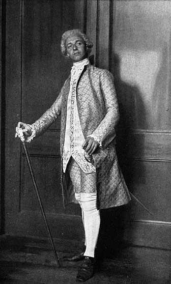 blue silk brocade and of course, as a gentleman, you always carry your sword.