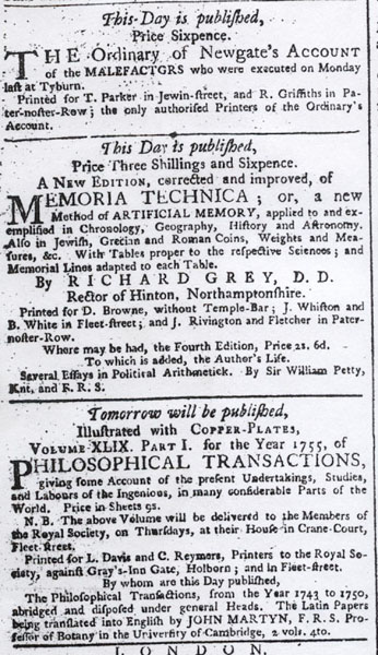 A book ad from the London Morning Advertiser #945, dated October 2, 1741.38 An ad from the London Morning Advertiser #1236, dated November 1, 1742.39