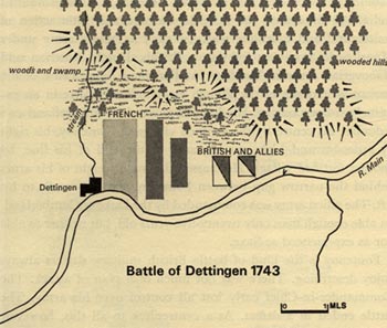 "[We] attacked the French with great fury, and after a terrible firing of near half an hour, the French ran away. Then they brought up their second line, which, after we had given them a huzza, we fell on and beat back in about half an hour. After this they presented us their third line in most beautiful order; when My Lord Stair came to the head of our regiment and commended the bravery of the whole line, and said he would himself see us make the third attack, upon which, after giving him three huzzas, the English march'd up with surprising resolution; but such a panick run thro' the French, at seeing our first line still able to oppose their third, that they turn'd about and retreated over the river with great expedition." -John Hughes, on the Battle of Dettingen (Black 63). |