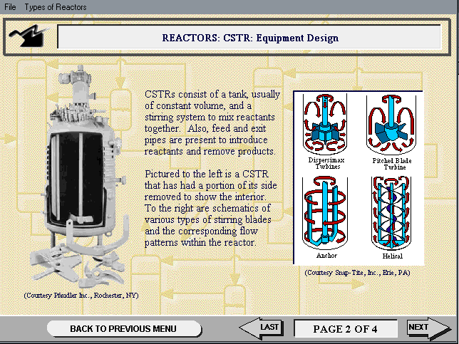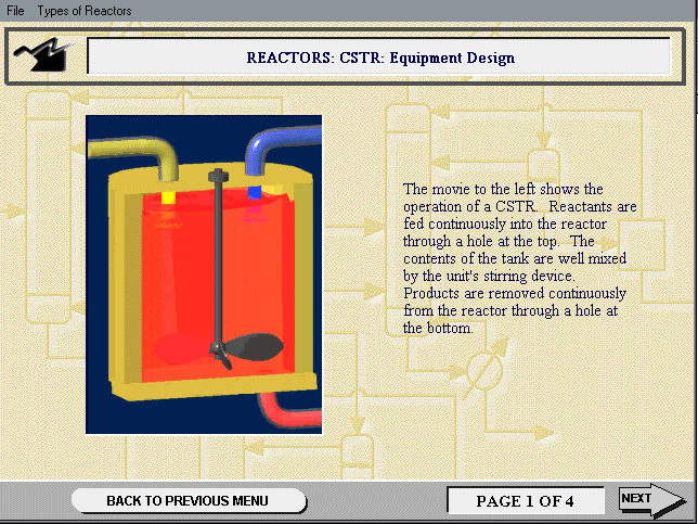 Let's say you're interested in the design details for CSTRS. Clicking on the Equipment Design button brings up a short movie that illustrates the continuous flow of reactants and products through a CSTR: