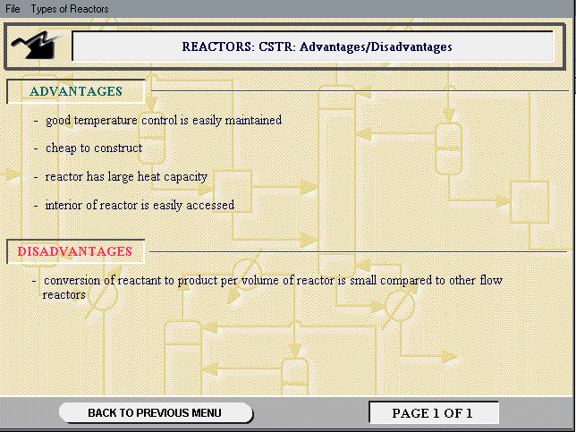 I forgot -- what were the pros and cons of using a CSTR? Let's take a look at the Advantages / Disadvantages section:
