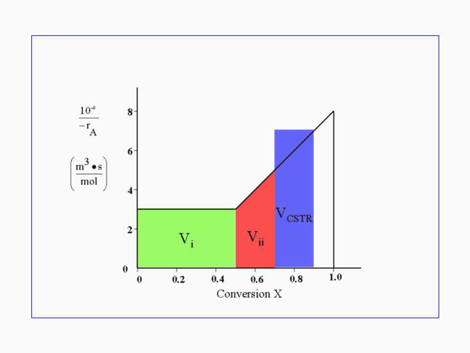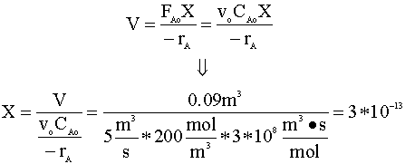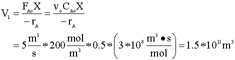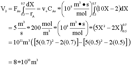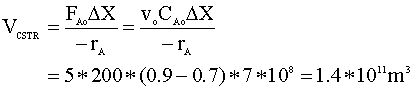 We notice that the new inverse of the reaction rate (1/-rA) is 7*108. We insert this new value into our CSTR mole balance equation: