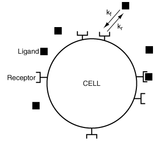 (c) The binding of ligand to receptor is actually a reversible reaction. For the binding of your ligand to receptors, the dissociation rate constant k r is 0.1 min -1 . Using the approximation justified in part (b) and assuming perfect mixing, calculate the percentage of receptors bound 5 min after you add the ligand to the media. (J. Linderman, University of Michigan)