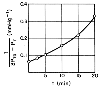 If this is the correct order, a plot of PTversus t should be linear. After using the data in Table CDE5-1.1 to obtain Figure CDE5-1.1, we see that PT is not a linear function of t. Consequently, we conclude that the reaction is not zero-order. | |