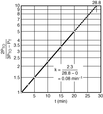 If the reaction is first order, a plot of versus t should be linear. After completing Table CDE5-1.2 using the raw data, a plot of as a function of time is made using semilog paper as shown in Figure CDE5-1.3. From the plot we see that is indeed linear with time, and we therefore conclude that the decomposition of di-tert-butyl peroxide follows first-order kinetics. From the slope of the plot in Figure CDE5-1.3, we can determine the specific reaction rate, k = 0.08 min -1 |