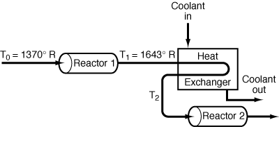 (Interstage cooling) In the reactor system shown in Figure CDP8-E, reactor 1 is operated at feed conditions identical to those given in Example 8-10. The stream leaving reactor 1 is cooled to T 2in a double-pass tube-and-shell heat exchange before entering reactor 2, which is operated adiabatically. Assuming that reactor 2 contains the same weight of catalyst as reactor 1, determine the optimum feed temperature to reactor 2 together with the conversion associated with this feed temperature.