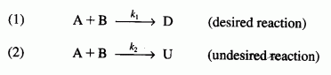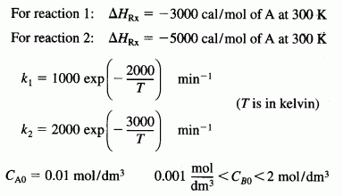 are carried out in a perfectly insulated CSTR. The desired reaction is first order in A and zero order in B, while the undesired reaction is zero order in A and first order in B. The feed rate is equimolar in A and B. Species A enters the reactor at a temperature of 100°C and species B enters at a temperature of 50°C. The operating temperature of the reactor is 400 K. The molar flow rate of A entering the reactor is 60 mol/min : CPA = 20 cal/(mol K), CPB = 30 cal/(mol K), CPD = 50 cal/(mol K), and CPU = 40 cal/(mol K).