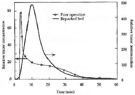 The relative tracer concentrations obtained from pulse tracer tests on a commercial packed-bed desulfurization reactor are shown in Figure 13-5. After studying the RTD, what problems are occuring with the reactor during the period of poor operation (thin line)? The bed was repacked and the pulse tracer test again carried out with the results shown in Figure 13-5 (thick line). Calculate the conversion that could be achieved in the commercial desulferization reactor during poor operation and during good operation (Figure 13-5) for the following reactions: