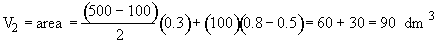 $V_2 = \dfrac{1}{2}(500 - 100) (0.8 - 0.5) + 100(0.8 - 0.5)= 90 dm^3$