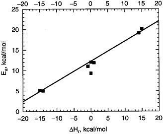 The Polyani equation correlates activation energy with heat of reaction. This correlation