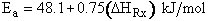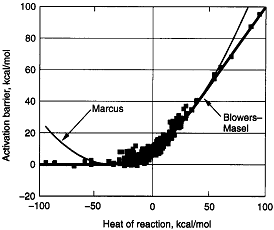 The Polyani Equation will predict negative activation energies for highly exothermic reactions Blowers and Masel developed a relationship that compares quite well with experiment throughout the entire range of heat of reaction for the family of reactions