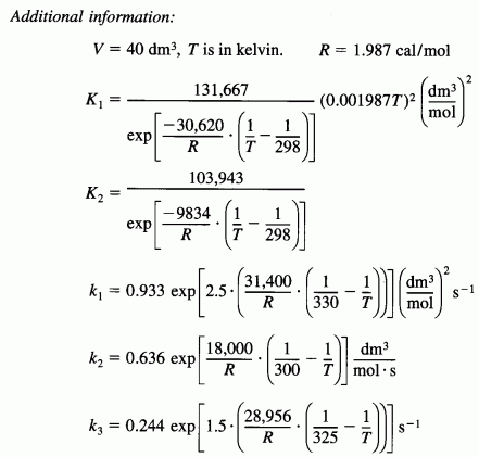 the reactions are elementary and take place in the gas phase. The reaction is to be carried out isothermally and, as a first approximation, pressure drop will be neglected. The feed consists of 7/15 hydrogen gas, 1/5 carbon monoxide, 1/5 carbon dioxide, and 2/15 steam. The total molar flow rate is 300 mol/s. The entering pressure may be varied between 1 atm and 160 atm, and the entering temperature between 300 K and 400K. Tubular (PFR) reactor volumes between 0.1 m3and 2 m3 are available for use.