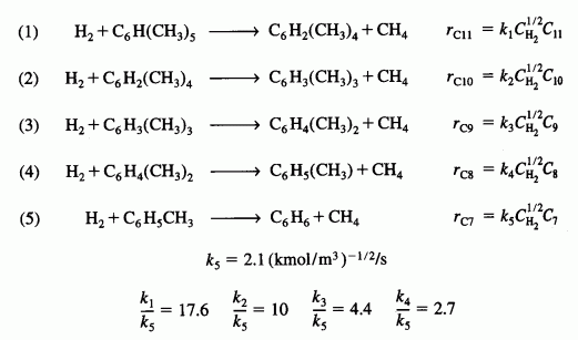 The following hydrodealkylation reactions occur over a Houdry Detol catalyst near 800 K and 3500 kPa: