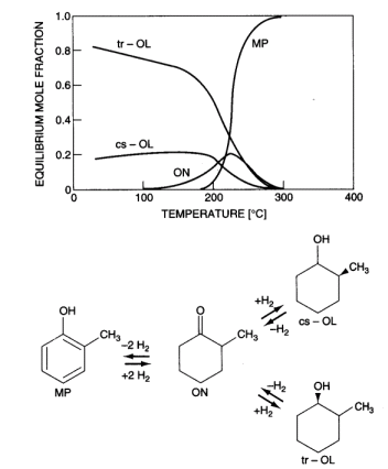 The hydrogenation of o-cresol 2-methylphenol (MP) is carried out over a Ni-catalyst [[Ind. Eng. Chem. Res., 28, 693 (1989)] to form 2-methylcyclohexanone (ON, which then reacts to form two stereoisomers, cis- (cs-OL) and trans(tr-OL)-2-methylcyclohexanol. The equilibrium compositions (on a hydrogen-free basis) are shown in Figure CDP6-H.