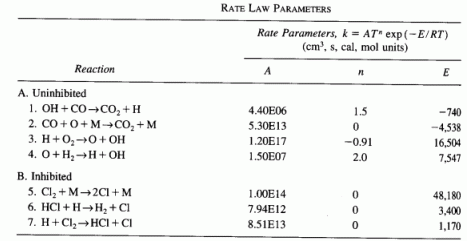 (Flame retardants) We now reconsider a more comprehensive version of the combustion of CO. The reactions and their corresponding rate law parameters are given in the table below. All reactions are assumed to be elementary [Combustion and Flame, 69 113 (1987)]. The precombustion compositions (mol %) are: