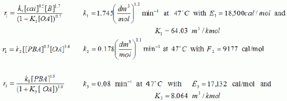 Oleic acid epoxide (E) is produced by the catalytic epoxidation of oleic acid (OA)[[J. Fotopoulos, C. Georgakis, and H. Stenger,Chem. Eng. Sci., 51, 1899 (1996)]. The raw materials are pure benzaldehyde (B) and oleic acid (OA). Unfortunately, undesired products are also formed, including benzoic (BA) and perbenzoic acids (PBA). The reaction sequence is