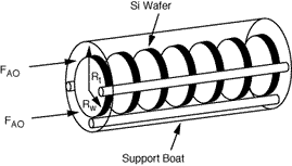 | The reacting gases diffuse out of the annular region into the space between the wafers where the mole fraction is represented by y A . As molecules diffuse radially inward, some of them are adsorbed and deposited on the wafer surface. The reaction products then diffuse radially outward into the gas stream axially flowing in the annulus. This system can be analyzed in a manner analogous to flow through a packed catalyst bed where the reaction gases diffuse into the catalyst pellets. In this analysis we used an effectiveness factor to determine the overall rate of reaction per volume (or mass) of reactor bed. We can extend this idea to LPCVD reactors, where the reactants diffuse from the annular flow channel radially inward between the wafers. | |||