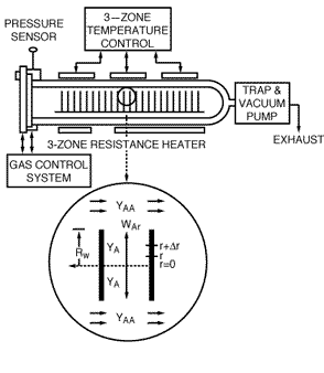 | where R t and R w are the radii of the tube and wafer, respectively. Because SiH 2 is being consumed by CVD, the mole fraction of SiH 2 (i.e., the reactant) in the annulus, y AA , decreases as the reactant flows down the length of the annulus. | |||