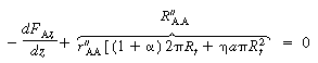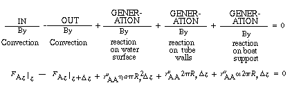 | 1. Balances. In forming our shell balance on the annular region we shall assume that there are no radial gradients in the annulus and include the outer tube walls and the boat, which consume some of the reactant by deposition on the walls in the balance. In addition, we shall neglect any dispersion or diffusion in the axial direction. Balance on reactant A: | |||